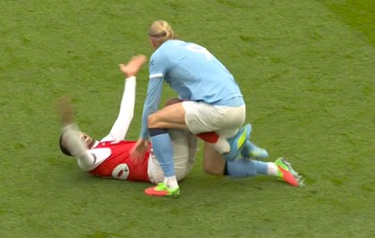 比赛第38分钟,哈兰德和加布里埃尔争抢高空球时双双倒地,二人从倒地到起身一直在缠斗。